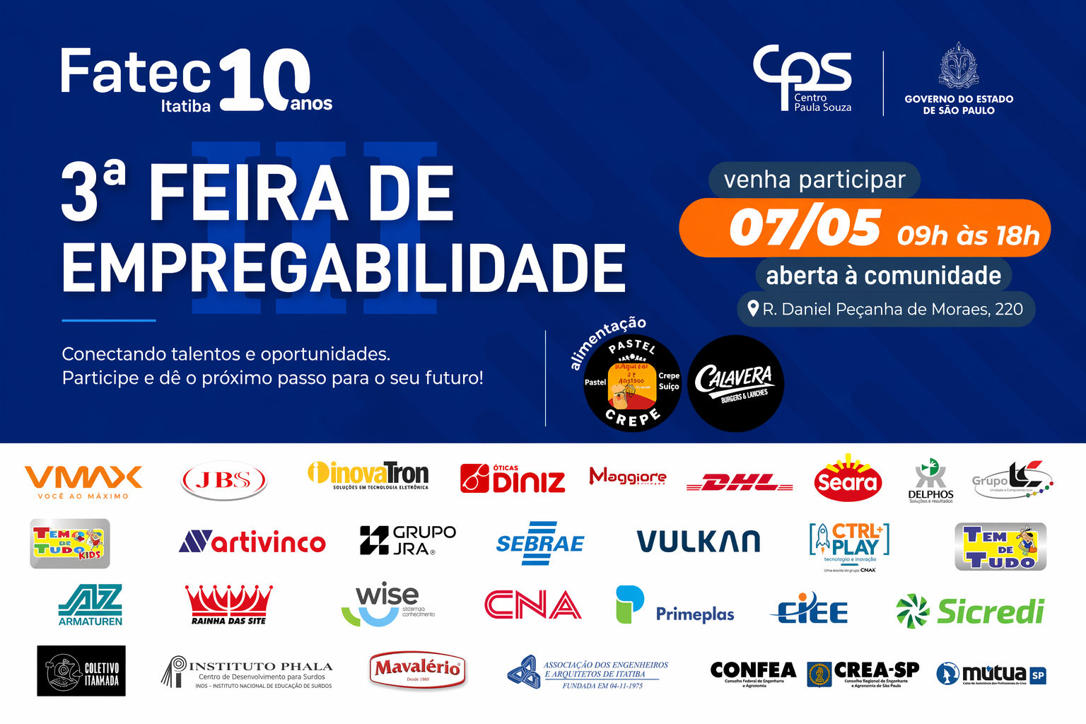 A Fatec Itatiba promoverá, no dia 7 de maio, a 3ª Feira de Empregabilidade, um evento voltado à conexão entre talentos, empresas e oportunidades profissionais. A programação acontecerá das 9h às 18h e será aberta à comunidade.